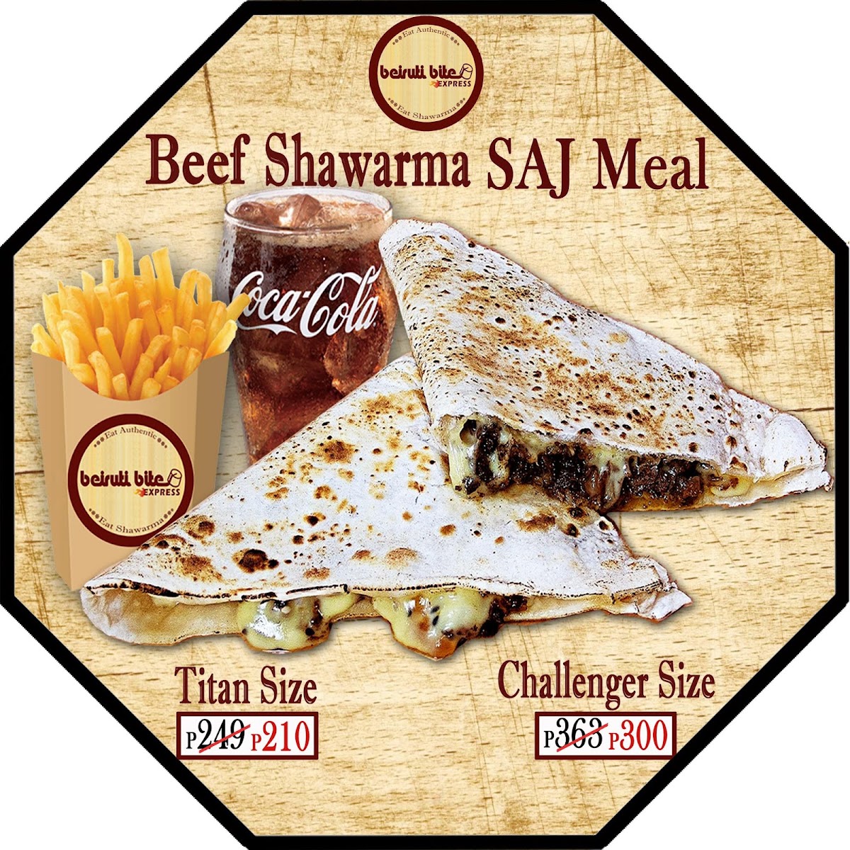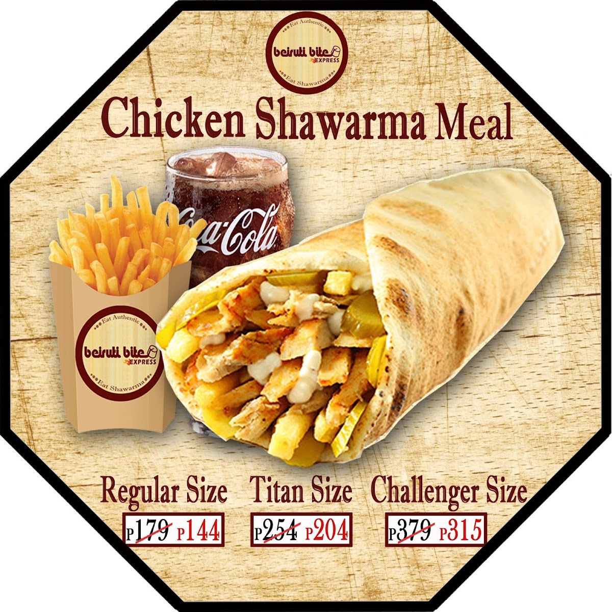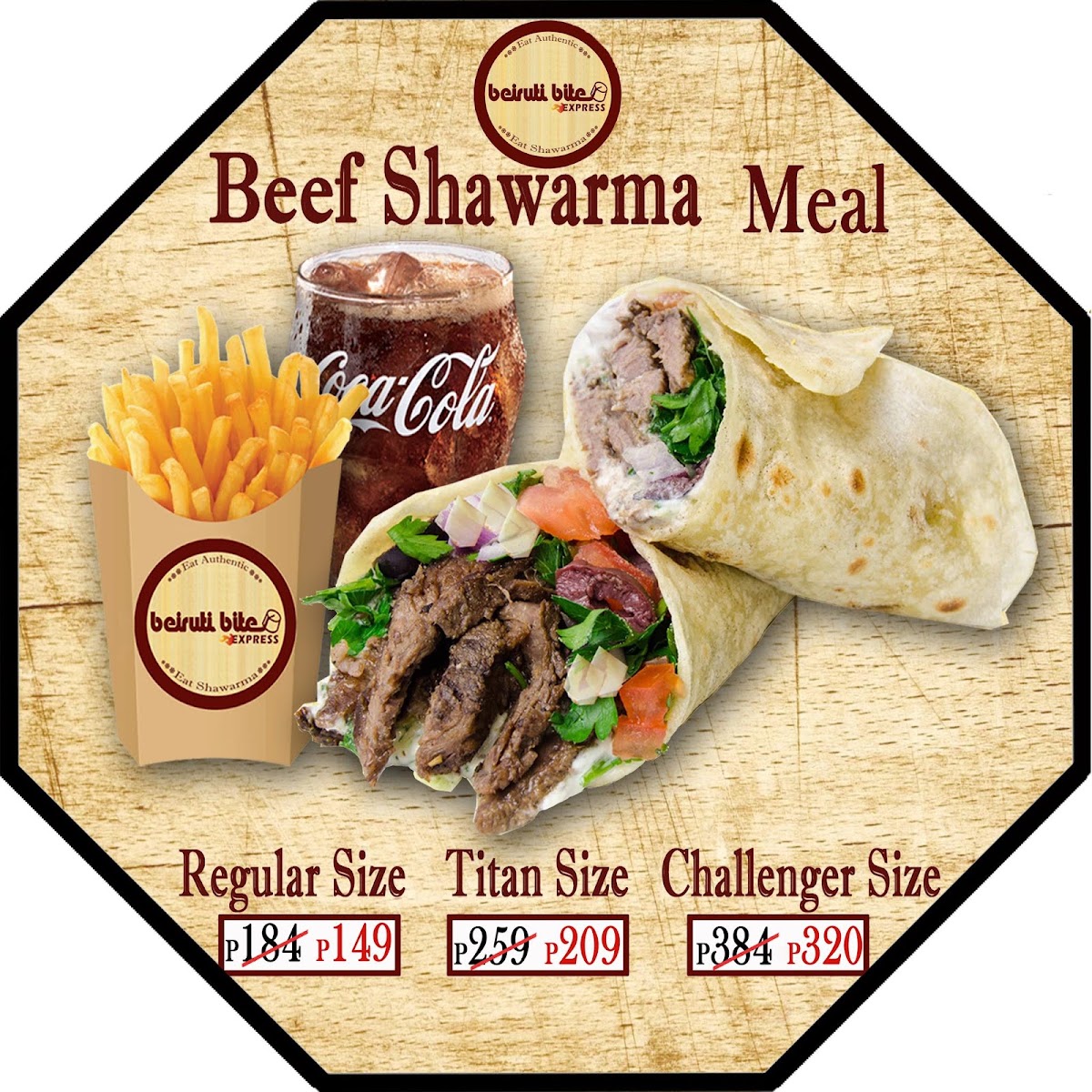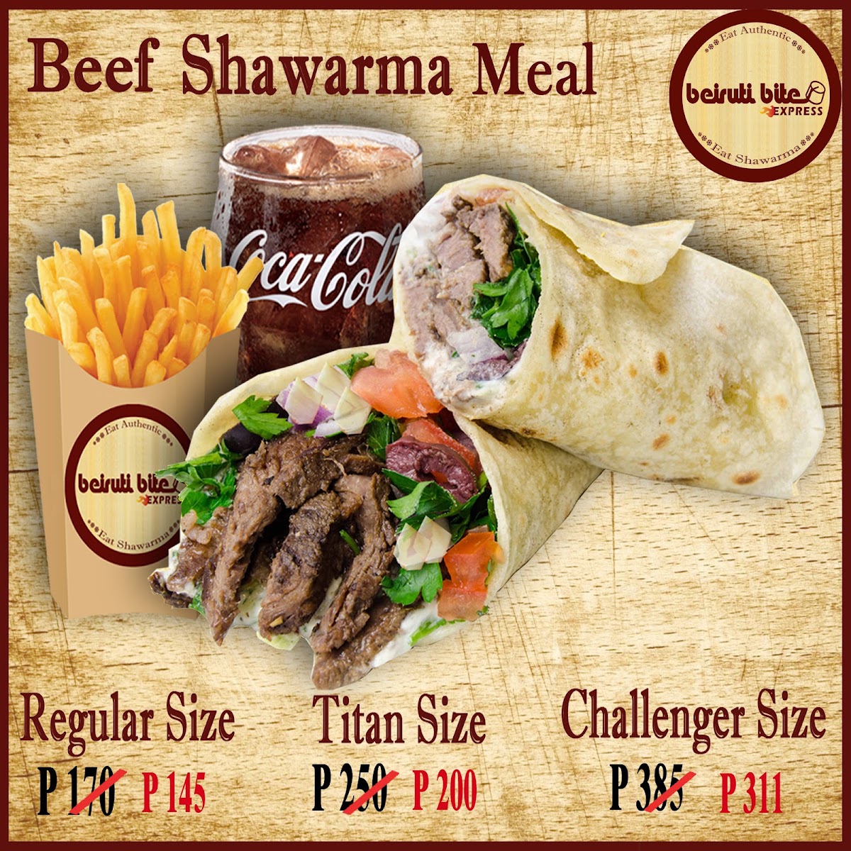 Good for 1. Our authentic beef shawarma with 200g of rice, tomato, cabbage & tahini paste. You can add garlic paste. One regular size fries & Coke beverage