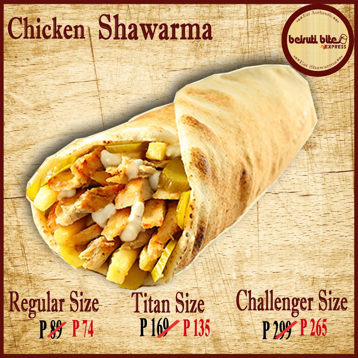 Good for 1. Our authentic combination of chicken shawarma, fries, pickles, garlic paste served in our amazing burger buns with one regular size fries & soft beverage